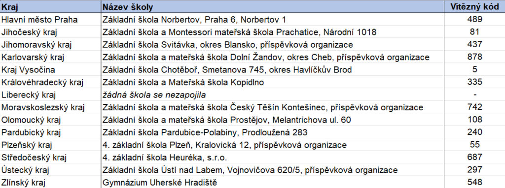 Gratulujeme všem vylosovaným! Detailní instrukce budou zaslány pedagogům, kteří školy do soutěže přihlásili. Sledujte prosím své e-mailové adresy.